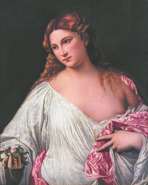 Titian's signature work Flora, currently on exhibition at Titian's Flora: Venetian Painting from the Uffizi Galleries at Bund One Art Museum in Shanghai. [Photo provided to China Daily]