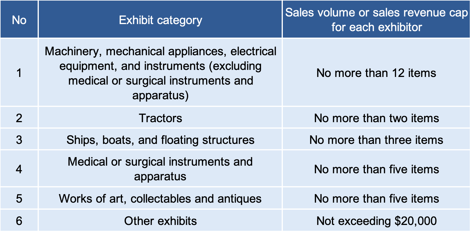 - For exhibits listed in Categories 1-5 of the Appendix, the policy applies to sales volumes not exceeding the limits specified in the Appendix for each exhibitor.