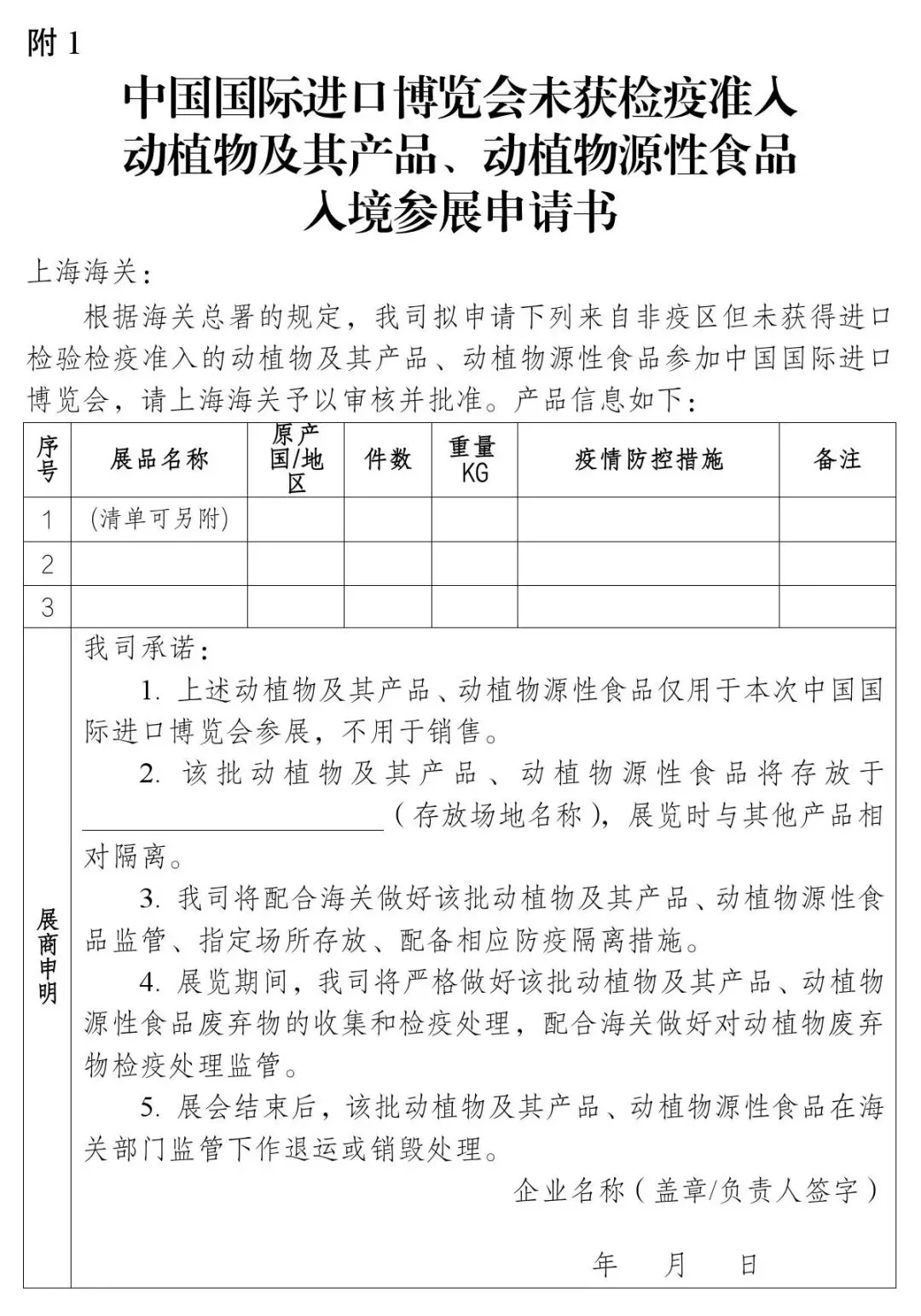 3. The application form for exhibition of animals, plants, and their products, as well as food of animal origin without quarantine access (see the attached).