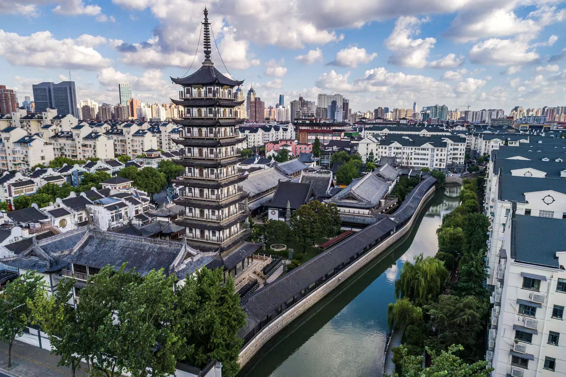 The Zhenru Pagoda within the temple, over 50 meters high, was built in the style of the Songjiang Fangta, a traditional wooden pagoda common in the Jiangnan region.