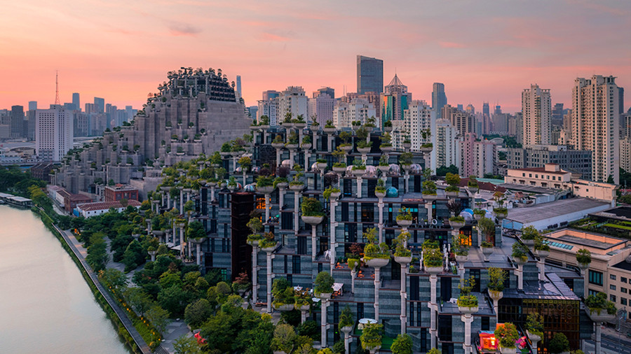 Over 20,000 plants cover the building's facade, creating a vertical forest-like landscape, with a 900-meter riverside walkway connecting to a public park.
