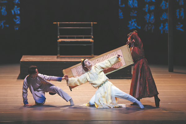In the dance drama, the young man also travels to the Tang Dynasty. Through a solo dance by Zhang Aoyue, who plays the role of the emperor, audiences witness the inner thoughts of the emperor, who expresses his fondness and respect for Wang Xizhi and Lantingji Xu.