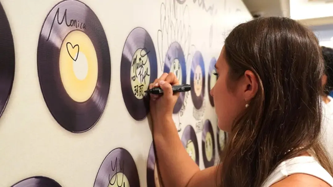 American students write their best wishes on a signature wall at the entrance of the Jazz at Lincoln Center Shanghai. [Photo/WeChat account of SPAFFC]