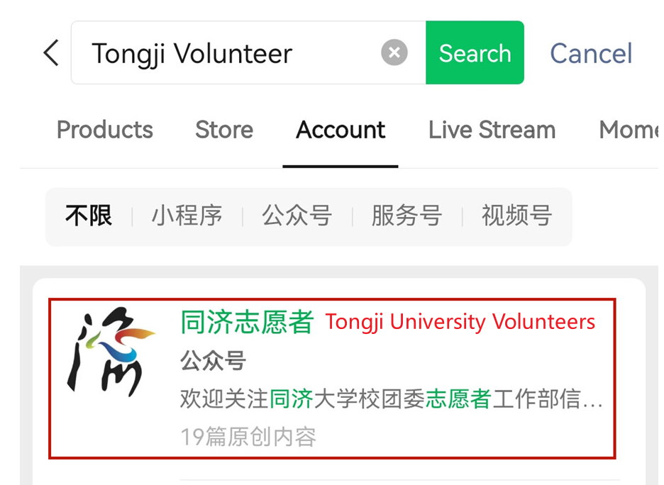 Clubs and associations: Many universities have volunteer associations or clubs that regularly share activity information. Joining these groups can provide you with direct access to volunteer opportunities. Search for "university name + volunteer" (for instance, "Tongji volunteer") on WeChat to find relevant public accounts.