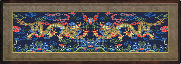 A piece of brocade inspired by the emperor's court dress from the Kangxi era of the Qing Dynasty, featuring two golden dragons chasing a pearl in the sky. The bottom part shows the rising rivers, cliffs and sea, surrounded by clouds.[Photo provided to China Daily]