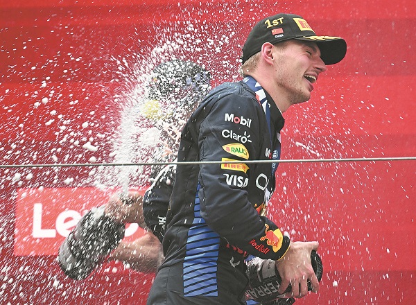 Red Bull Racing driver Max Verstappen of the Netherlands celebrates on the podium on April 21 after winning the Chinese Grand Prix. WEI XIAOHAO/CHINA DAILY
