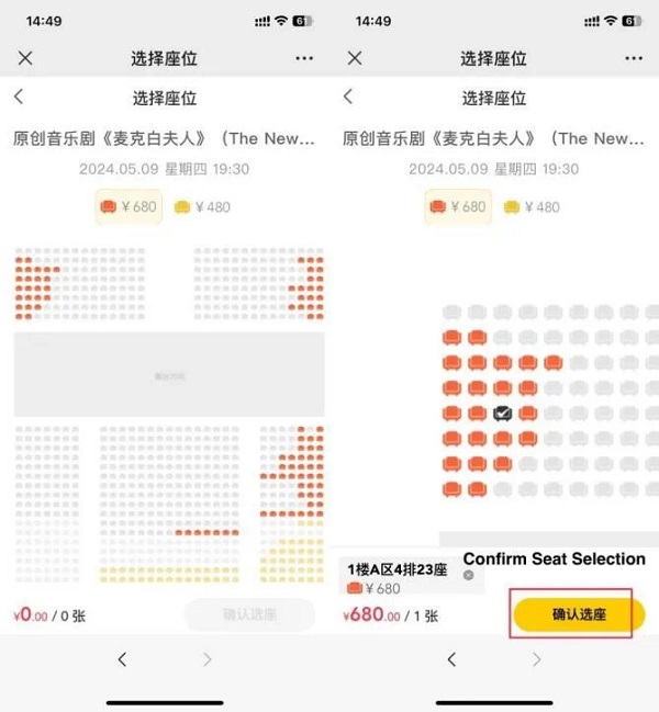 View seating plan. Red areas are for 680-yuan tickets and yellow for 480 yuan. Choose seats and click "Confirm Seat Selection".