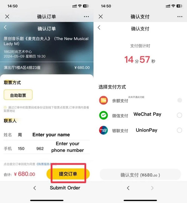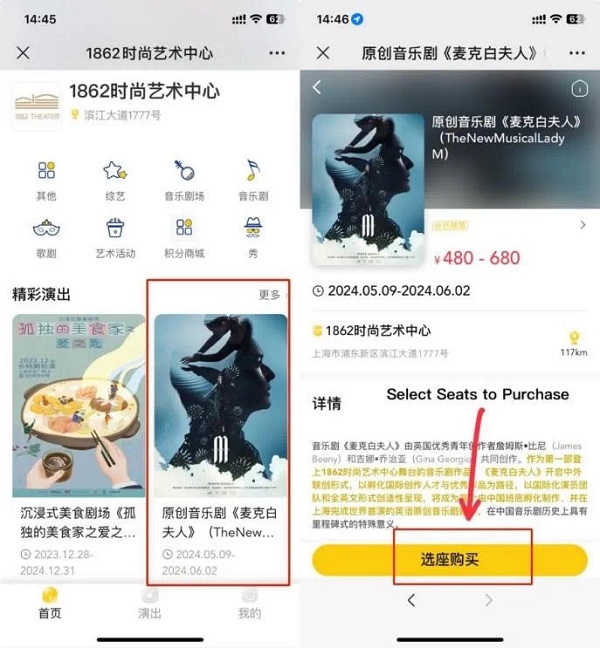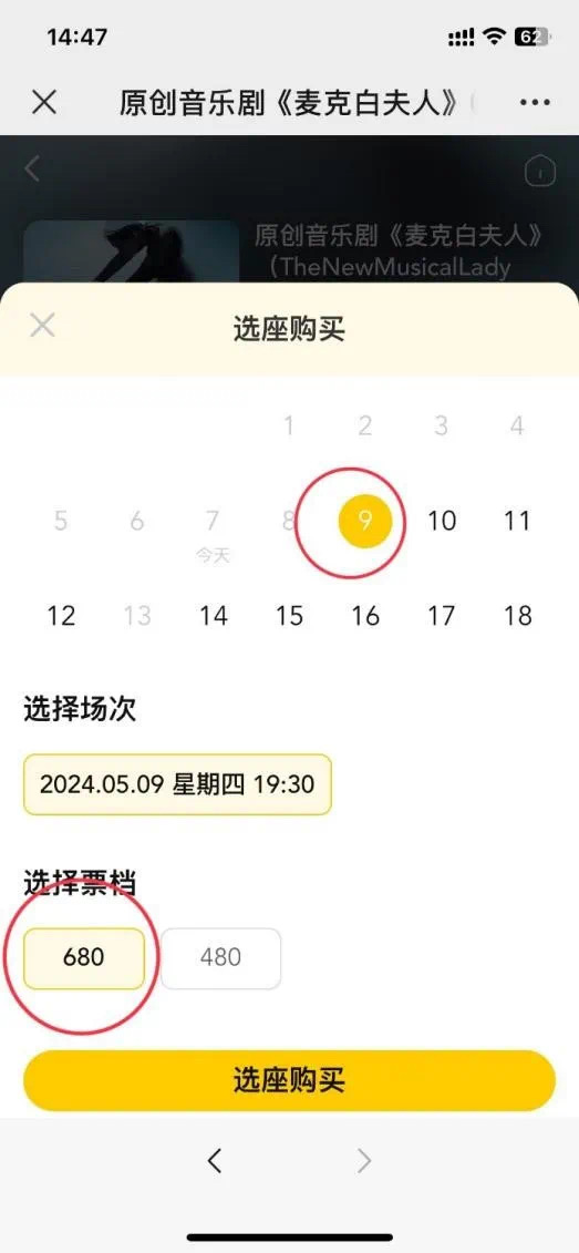 Choose your preferred date and ticket category (E.g.: May 9, 7:30 pm, 680-yuan category).