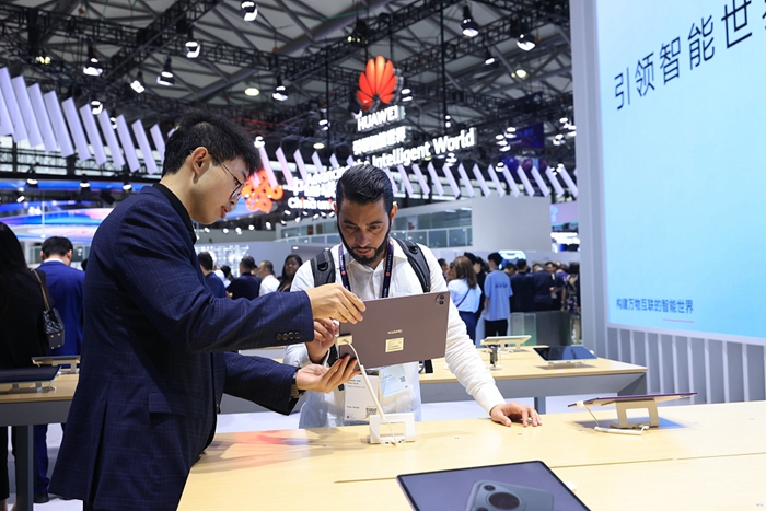 A visitor checks out a tablet at Huawei's booth, at the 2024 MWC held at Shanghai New International Expo Center, in Shanghai, June 26, 2024. [Photo/VCG]