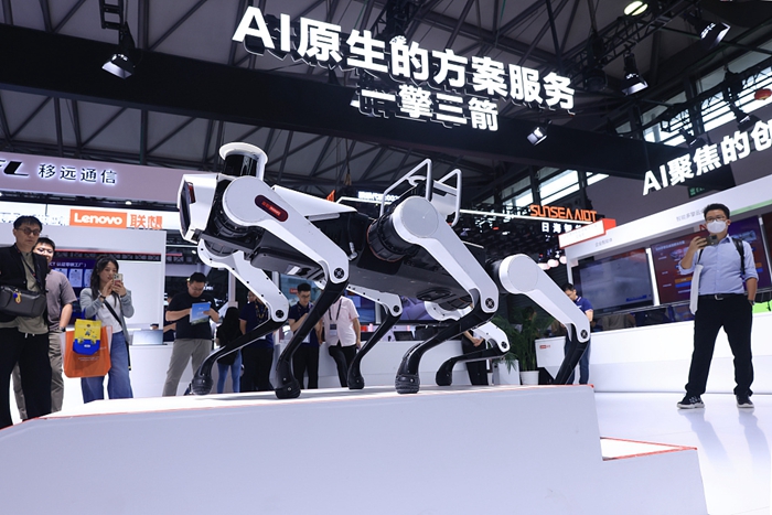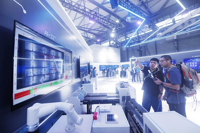 People have a look at "AI+factory" demonstration model at the 2024 MWC held in Shanghai, June 26, 2024. [Photo/VCG]
