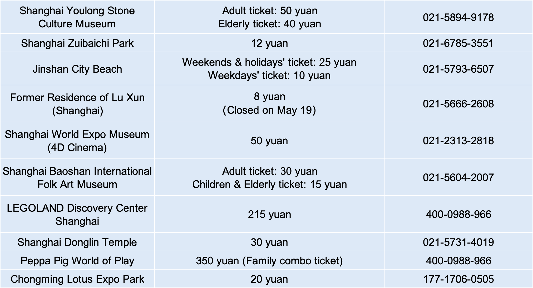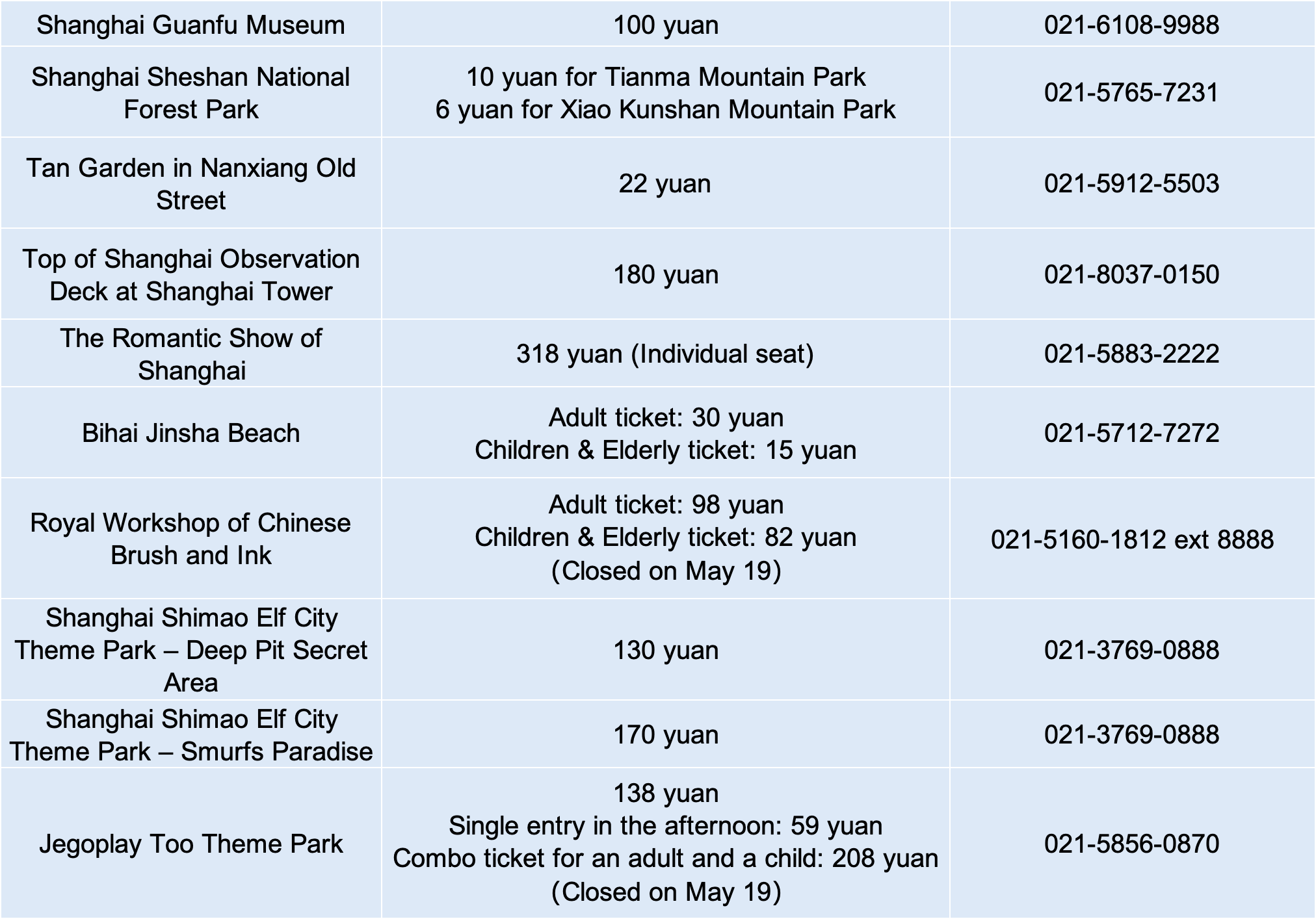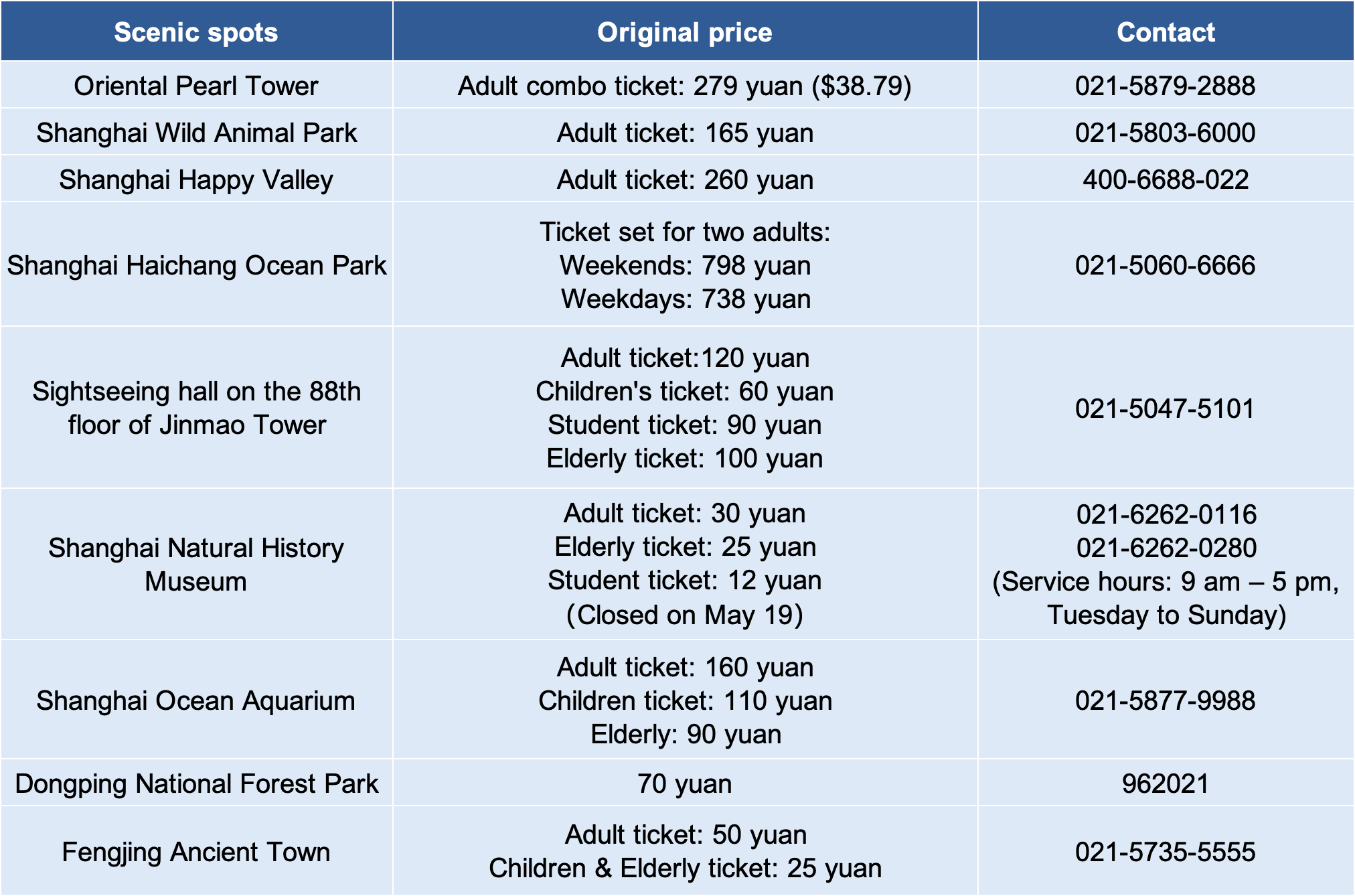 May 19 marks the 15th China Tourism Day. To celebrate, 56 scenic spots across Shanghai will offer half-price admission from May 17 to 19.