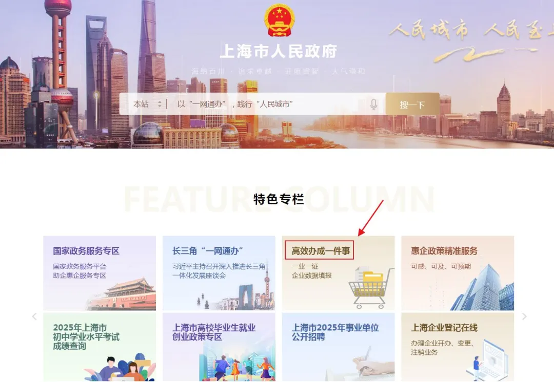 1. Click the "One-stop Service Platform" (高效办成一件事) at the official website of the Shanghai Municipal People's Government.