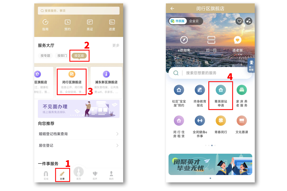 Apply at least 48 hours in advance via Shanghai's government service platform "Suishenban" app — Minhang Flagship Store (闵行区旗舰店) — "Talent Station Application" (菁英驿站申请) section.