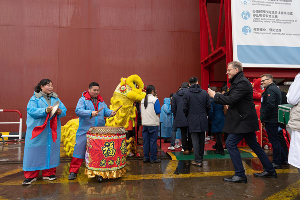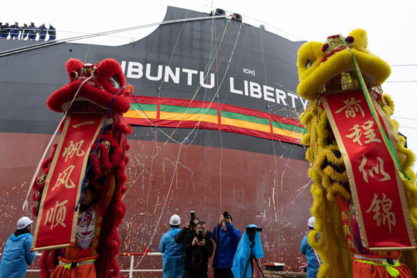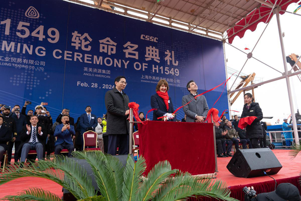 A dual-fuel powered bulk carrier with a capacity of 190,000 deadweight tons is named and delivered to its owner on Feb 28, 2024 by China State Shipbuilding Corporation's (CSSC) Shanghai Waigaoqiao Shipbuilding Co Ltd. [Photo by Gao Erqiang/China Daily]