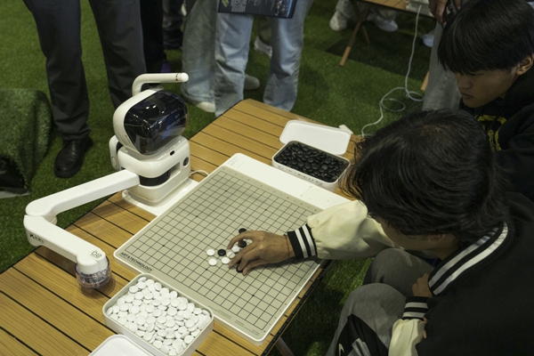 An attendee plays a game with a robot at the SenseTime Group Inc booth during an expo in Wuxi, Jiangsu province. BLOOMBERG