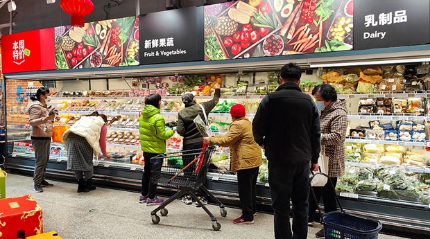 Customers shop for vegetables in Shanghai on Jan 30, 2023. [Photo/VCG]