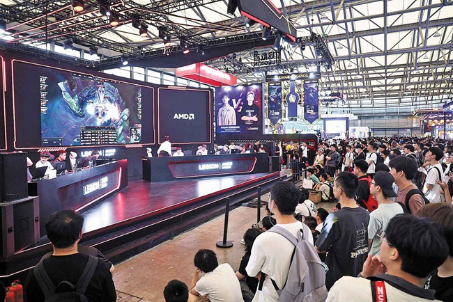 Visitors gather at a booth where a game show is put on by the organizer during the China Joy, a yearly gaming event, in Shanghai in July 2023. XU PEIQIN/FOR CHINA DAILY