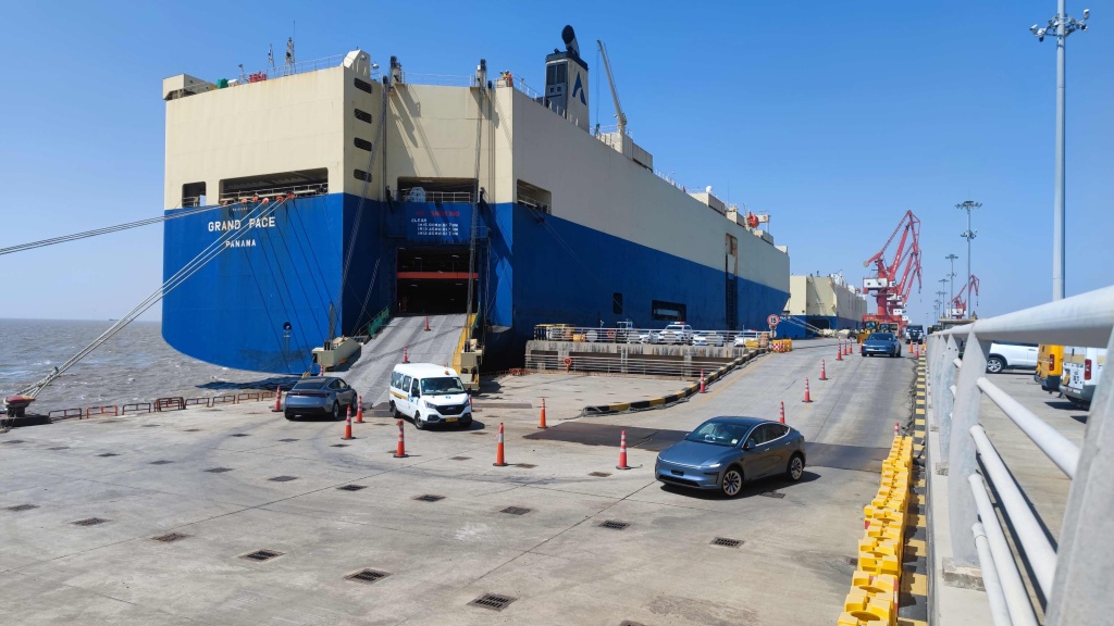The first shipment of 3,015 revamped Tesla Model Y electric vehicles, produced at Shanghai's Tesla Gigafactory in the Lin-gang Special Area, was loaded onto the Grand Pace, a Panama ro-ro (roll-on/roll-off) vessel, on April 15 at the Nangang Terminal of Shanghai Port.