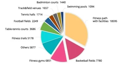 The city is home to 1,657 track and field venues, 1,094 swimming venues, 18,926 ball sports venues, 34 ice and snow sports venues, and 18,595 national fitness trails.