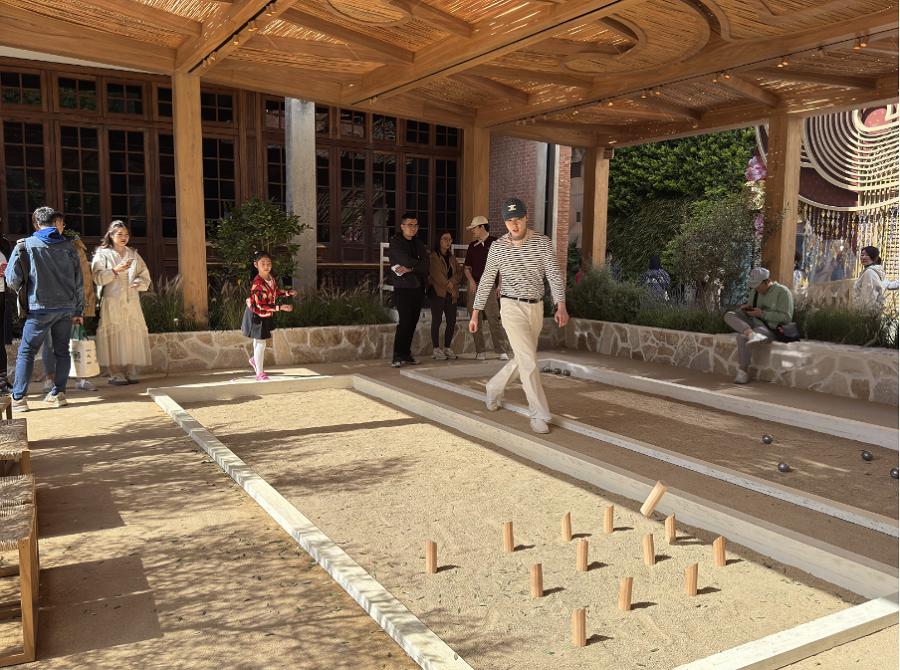 Next to the garden is a leisure area with fine sand, inviting guests to play Finnish keels or skittles and France's beloved petanque — two classic European outdoor games. A charming ice cream cart nearby offers cool refreshments between rounds.