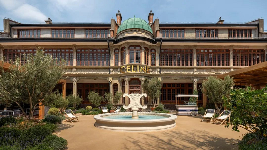 Visitors enter through a lush garden inspired by France's celebrated Provence region — filled with olive trees, lemon trees and lavender, all surrounding a central fountain topped with Celine’s iconic emblem.