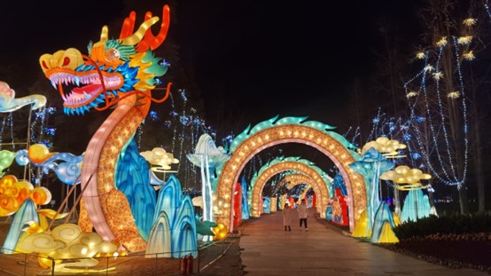A colorful dragon display with its body coiled into five arches lights up the night. [Photo by LIU LANYING for China Daily]