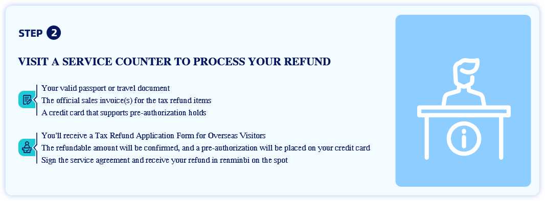 Note: If my total purchase amount exceeds 222,200 yuan, the amount above this limit must be refunded through the standard departure tax refund process.Here are some of our most frequently asked questions. If yours isn't listed, feel free to email us at intlservices@shanghai.gov.cn.
