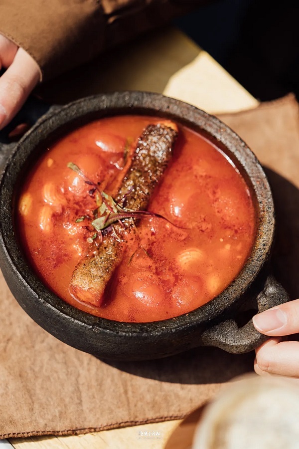 The red sour soup, sourced from Guizhou and fermented with local high-acidity wild tomatoes, offers a distinct and refreshing sensation. The fish is well-seasoned and the pasta is perfectly boiled, reminiscent of maoerduo, cat ear-shaped noodles in North China.