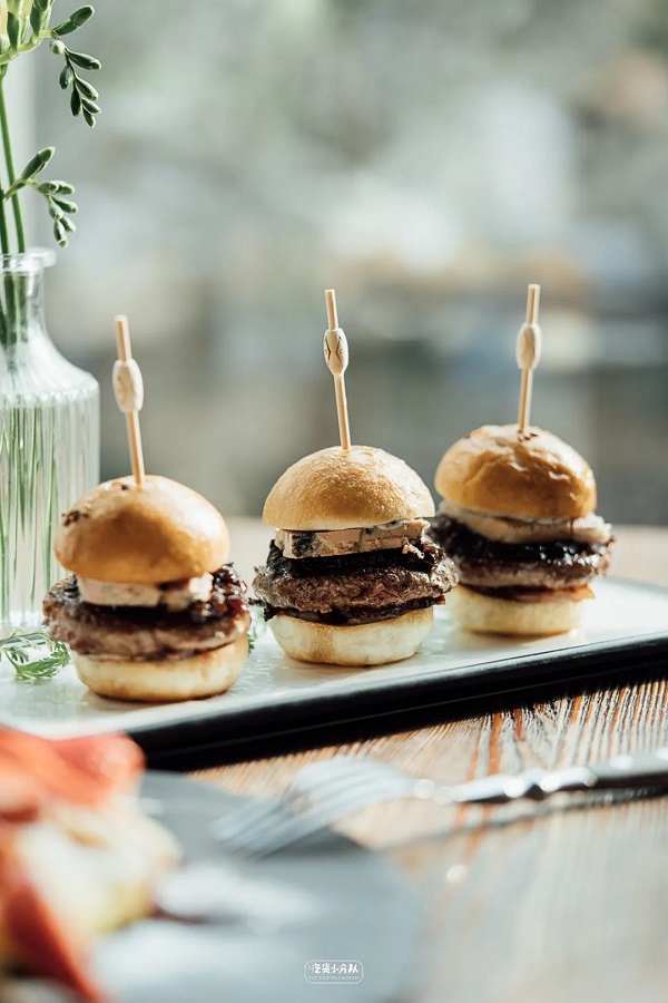 The signature mini burger breaks the stereotype of being fast food. Meticulously crafted with four layers, each component is carefully prepared, starting from raw materials. The beef patty, made from a selection of two beef cuts, is blended with rich foie gras fat and various spices, resulting in an exceptionally flavorful experience.