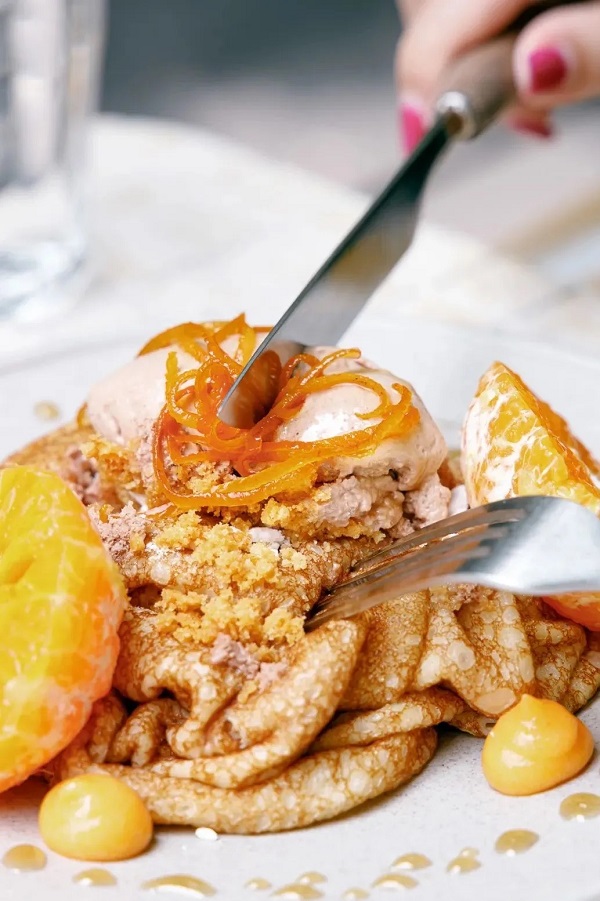 The ingenious combination of chocolate and orange offers a delightful blend of sweet and tangy flavors. The crepe itself is soft and chewy, and when stacked together, it fully envelops the orange sauce and chocolate cream. The candied orange peel on top adds a unique touch, offering three different orange flavors in one crepe.