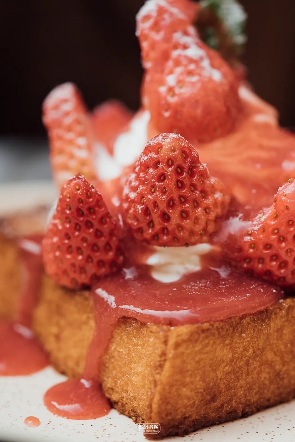 A delightful dessert on a spring day, this dish wins with its visual appeal. Fresh strawberries, dense cream with hints of vanilla seeds, and homemade strawberry sauce create a sweet and tangy sensation. The toast base is baked to a crisp, carefully divided into eight pieces, perfectly sized for an elegant dessert experience.