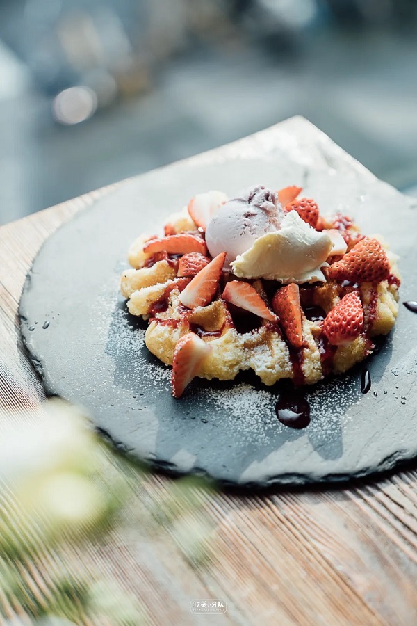 Ranked as the No 2 waffle in Shanghai, this dish is a brunch highlight. The outer layer is crisp, while the inside is unexpectedly fluffy. The homemade strawberry sauce, dripped in the small squares, exudes a rich, sweet, and sour flavor. Fresh strawberries add a natural and refreshing touch, creating a balanced blend of sweet, tangy flavors.