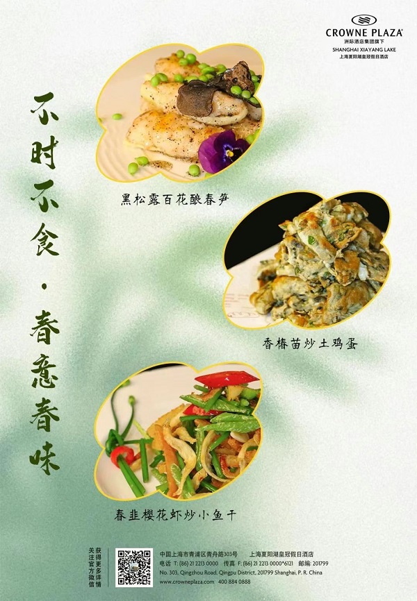 As nature flourishes in the warmer weather, Citic Pacific Zhujiajiao Jin Jiang Hotel's Chinese restaurant offers a spring menu incorporating the fragrance of wild vegetables, the freshness of fish and shrimp, and the tenderness of poultry.