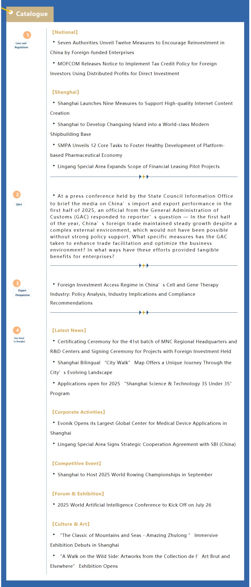 Shanghai Weekly Bulletin is an information service presented by the Foreign Affairs Office of Shanghai Municipal People's Government in collaboration with Wolters Kluwer to foreign-funded enterprises, foreign-related institutions as well as people from overseas living in Shanghai. Covering major national and Shanghai foreign-related news, event information, policy Q&A and interpretations in the past week, it keeps you up-to-date with the latest foreign-related policies and developments in Shanghai.
