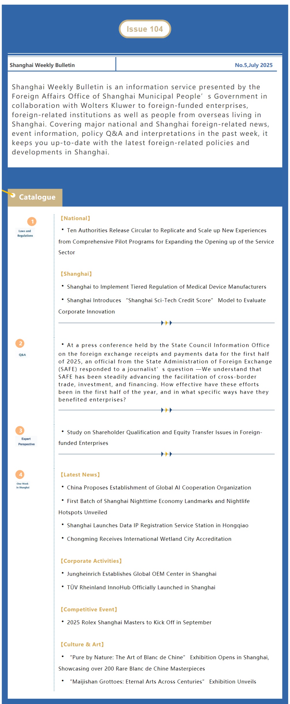 Shanghai Weekly Bulletin is an information service presented by the Foreign Affairs Office of Shanghai Municipal People's Government in collaboration with Wolters Kluwer to foreign-funded enterprises, foreign-related institutions as well as people from overseas living in Shanghai. Covering major national and Shanghai foreign-related news, event information, policy Q&A and interpretations in the past week, it keeps you up-to-date with the latest foreign-related policies and developments in Shanghai.
