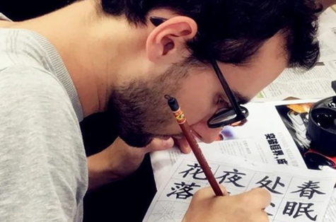 A student practices Chinese calligraphy. [Photo/dhu-ices]