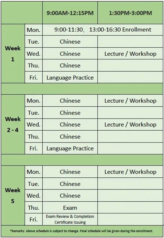 ※ Three-week program: No final exam, students will receive the proof of enrollment, but no program completion certificate.