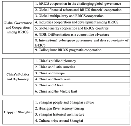 The program provides participants with lectures throughout one month, consisting of three modules — "Global Governance and Cooperation among BRICS", "China’s Politics and Diplomacy", and "Happy in Shanghai", among which participants of "Global Governance and Cooperation among BRICS", "China's Politics and Diplomacy" will receive four credits.