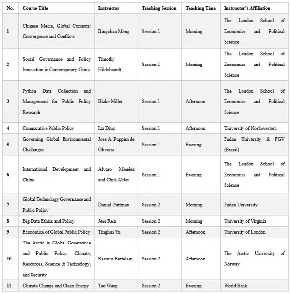 In 2024, the International Summer School will provide 11 courses that encompass key areas of global public policy. The curriculum is both compact and thought-provoking. Exciting course introduction videos can be found on the official website. All courses will be delivered in person (except for the International Development and China course, which will include two online teaching sessions). The teaching schedule is outlined below.