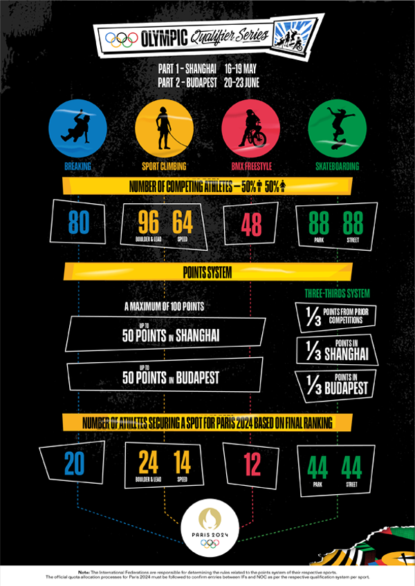 Athletes in BMX freestyle, sport climbing, and breaking will compete for a maximum of 50 points at each of the events in Shanghai and Budapest, making a maximum possible total of 100 points per athlete. Points from both stops will be compiled into a ranking for each of the sports, that will determine which athletes earn quota places for Paris 2024.