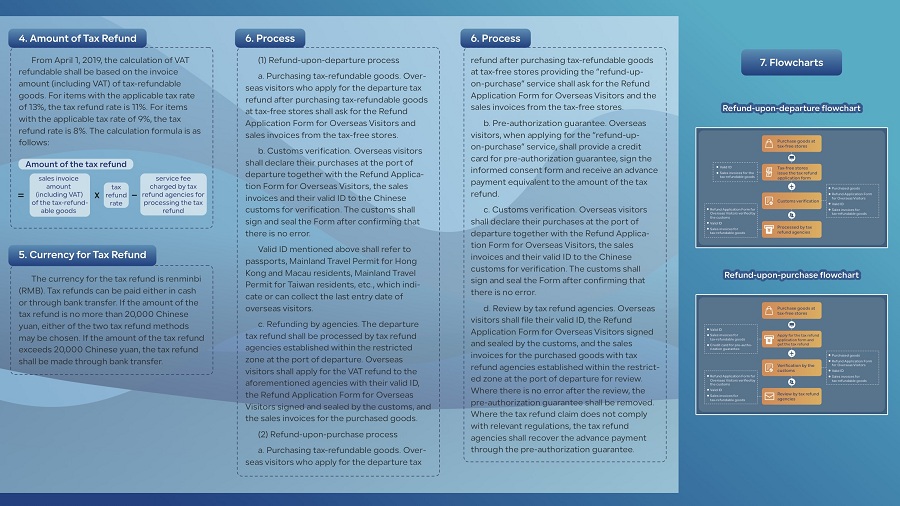 Overseas visitors can be refunded value-added tax (VAT) for the tax-refundable goods they purchase at tax-free stores when they leave China from ports of departure.