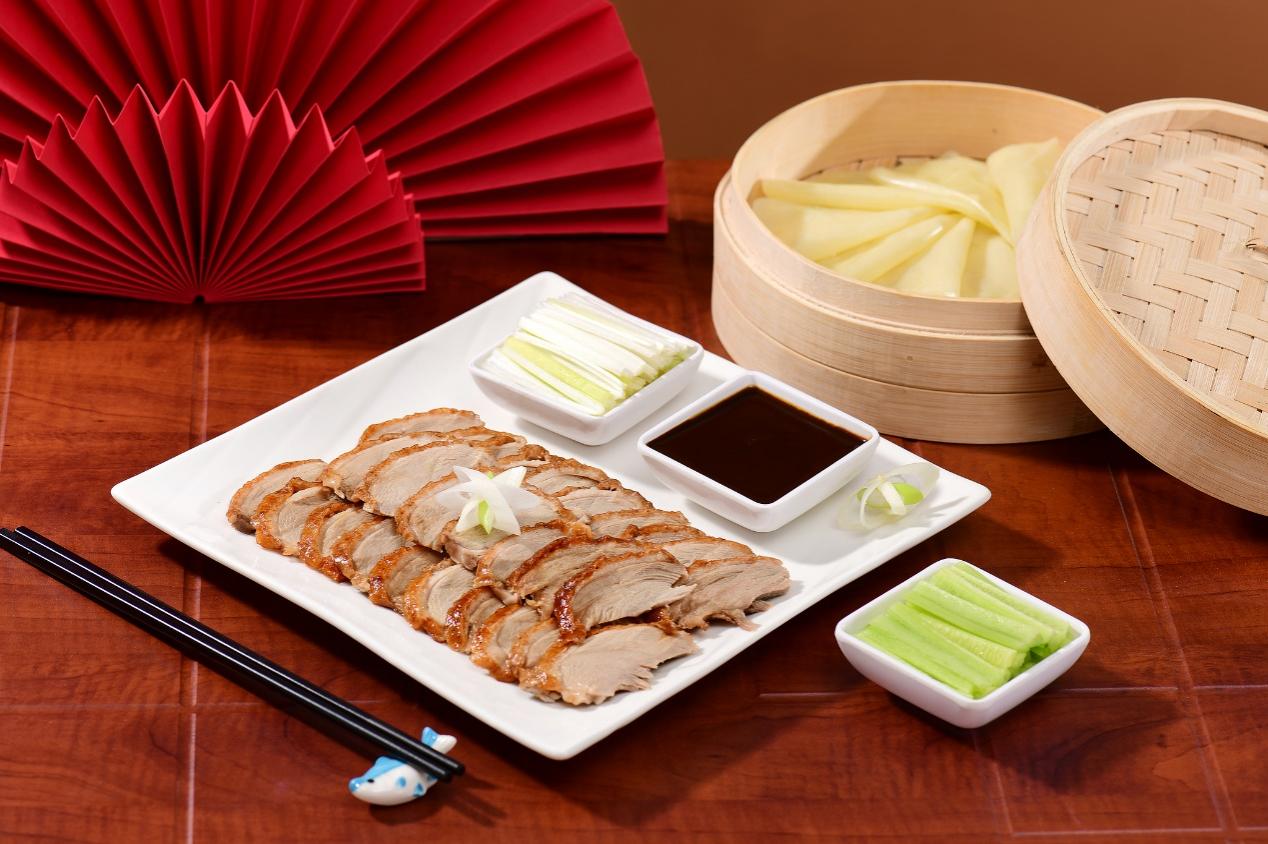 Beijing Roast Duck: Crispy skin and tender meat wrapped in paper-thin pancakes at Quanjude restaurant.