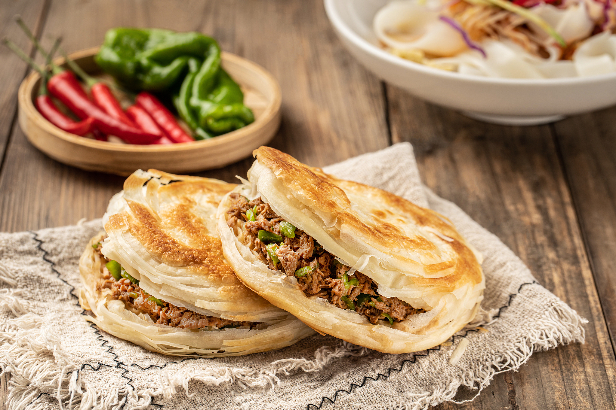 Roujiamo: Sink your teeth into a "Chinese burger" — slow-braised pork stuffed in crispy flatbread.