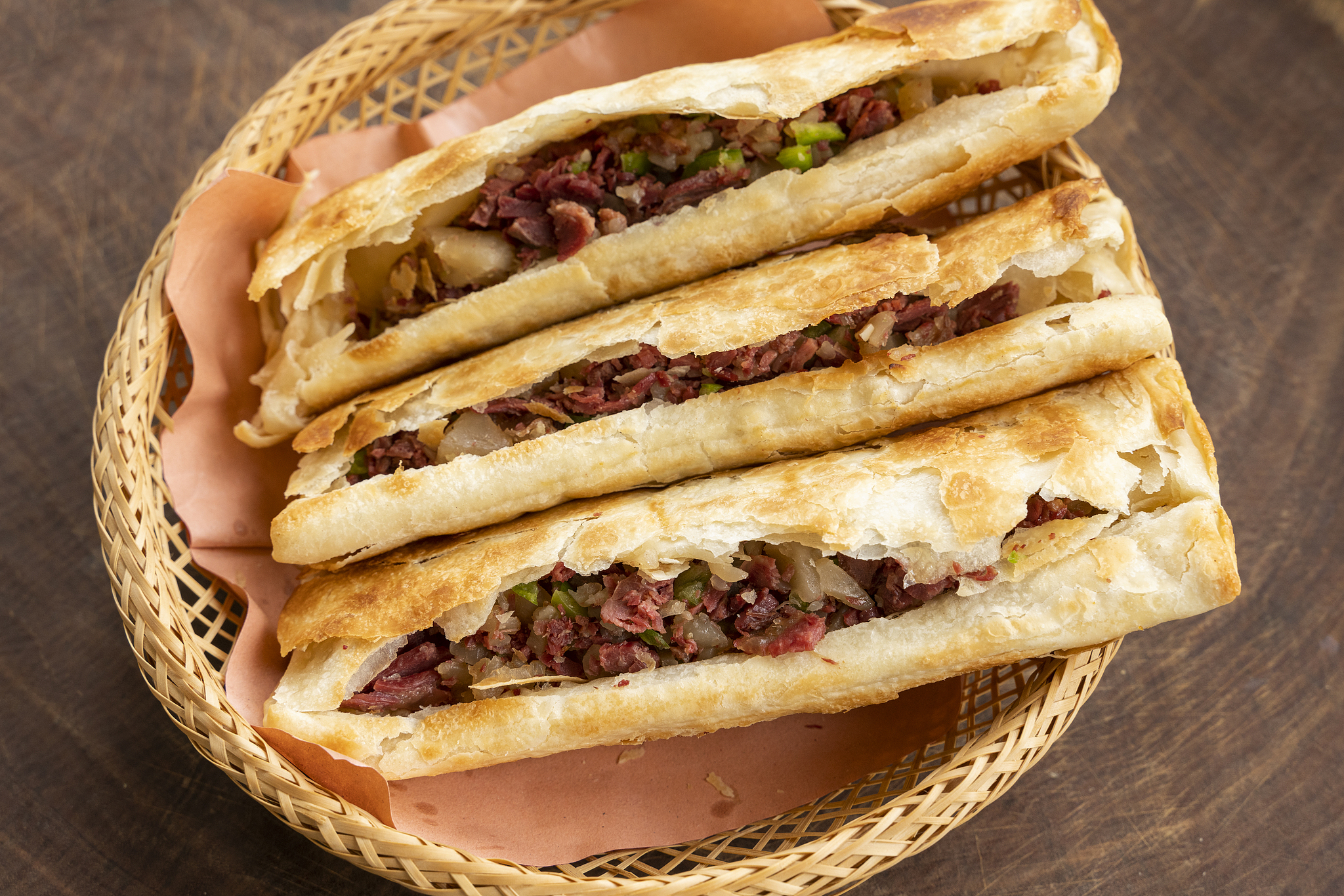 Donkey Burger (lyurou huoshao): Shredded donkey meat stuffed in crispy baked buns, a Baoding specialty best enjoyed at local restaurants.