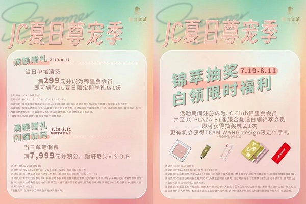 To coincide with the launch of the collection, JC Plaza is hosting a summer shopping season that began on July 19 and runs until Aug 11. Shoppers who spend over 299 yuan ($41.11) on a single purchase and become members will receive a special summer gift package.